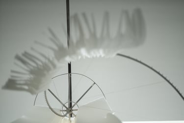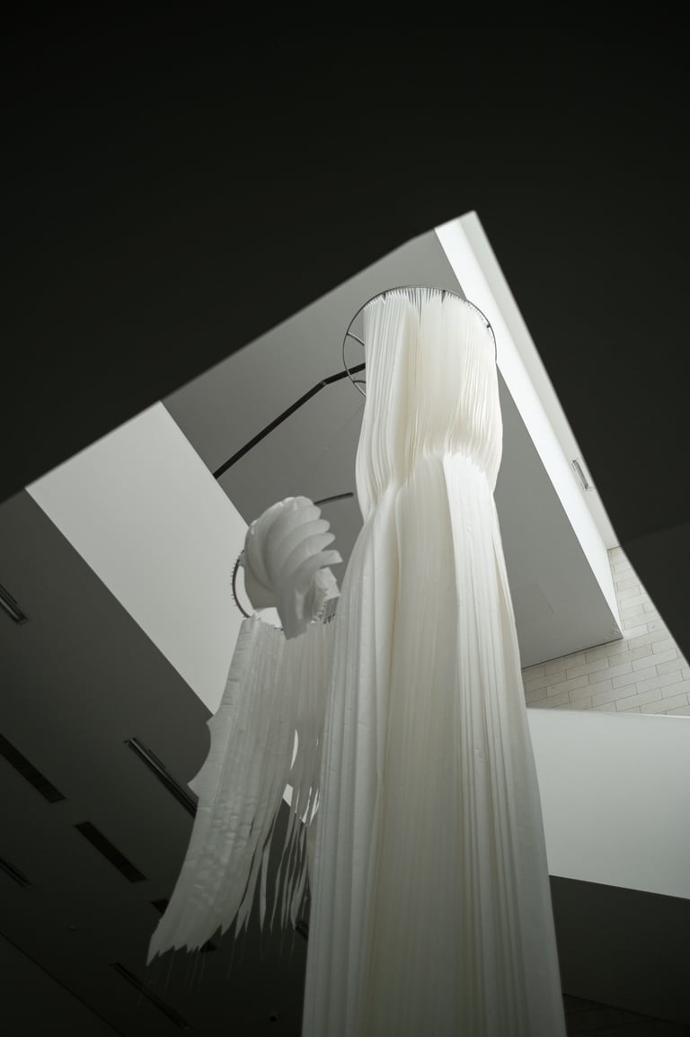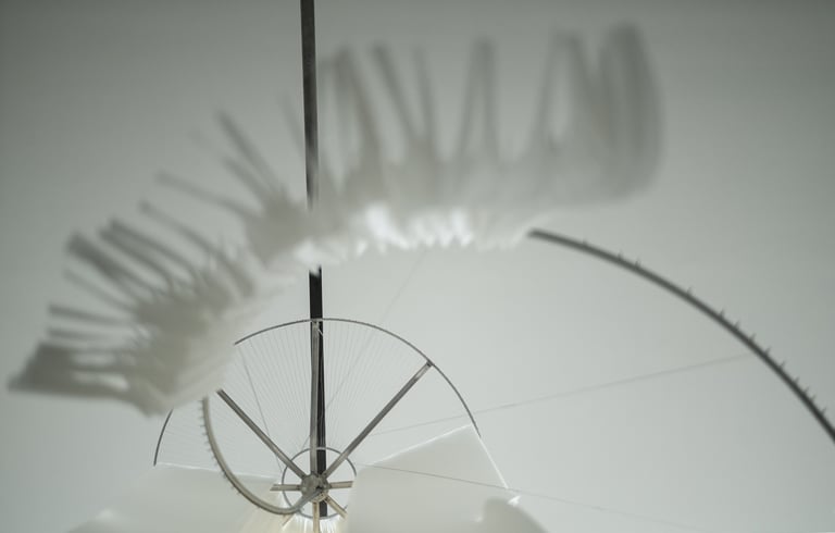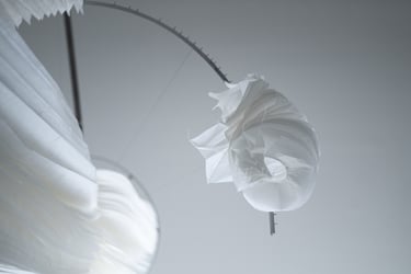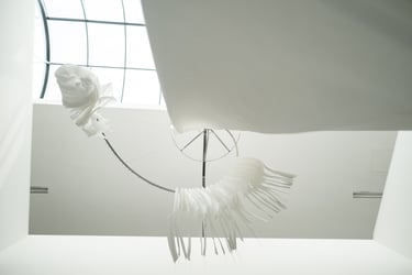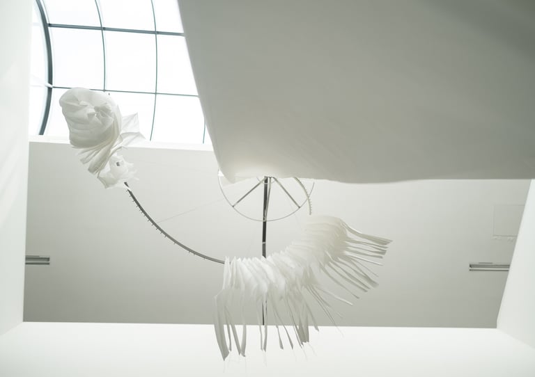 Through its construction, paper becomes something else: no longer a base for images or text, but a responsive material that resists and constantly changes. Light, void, and fragility are not only visible but embedded within the form. The whiteness of the paper acts as a conceptual tool, removing cultural markers and inviting new interpretation. It becomes a metaphor for learning and transformation, questioning fixed identities and social constructs.