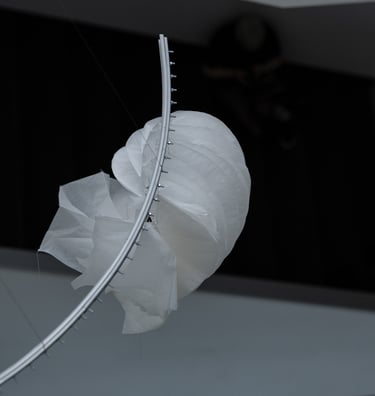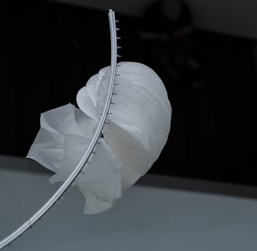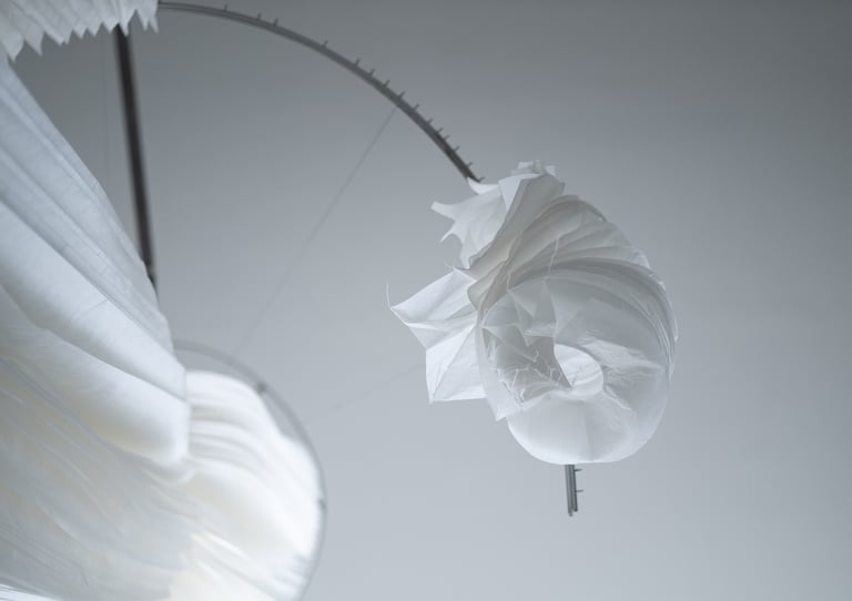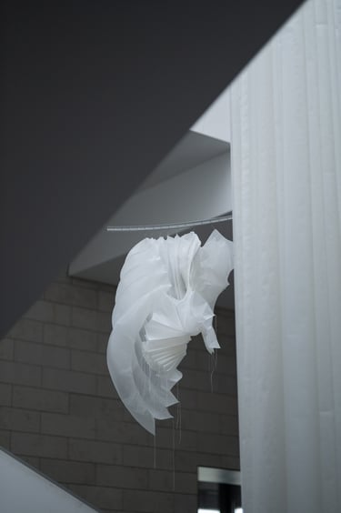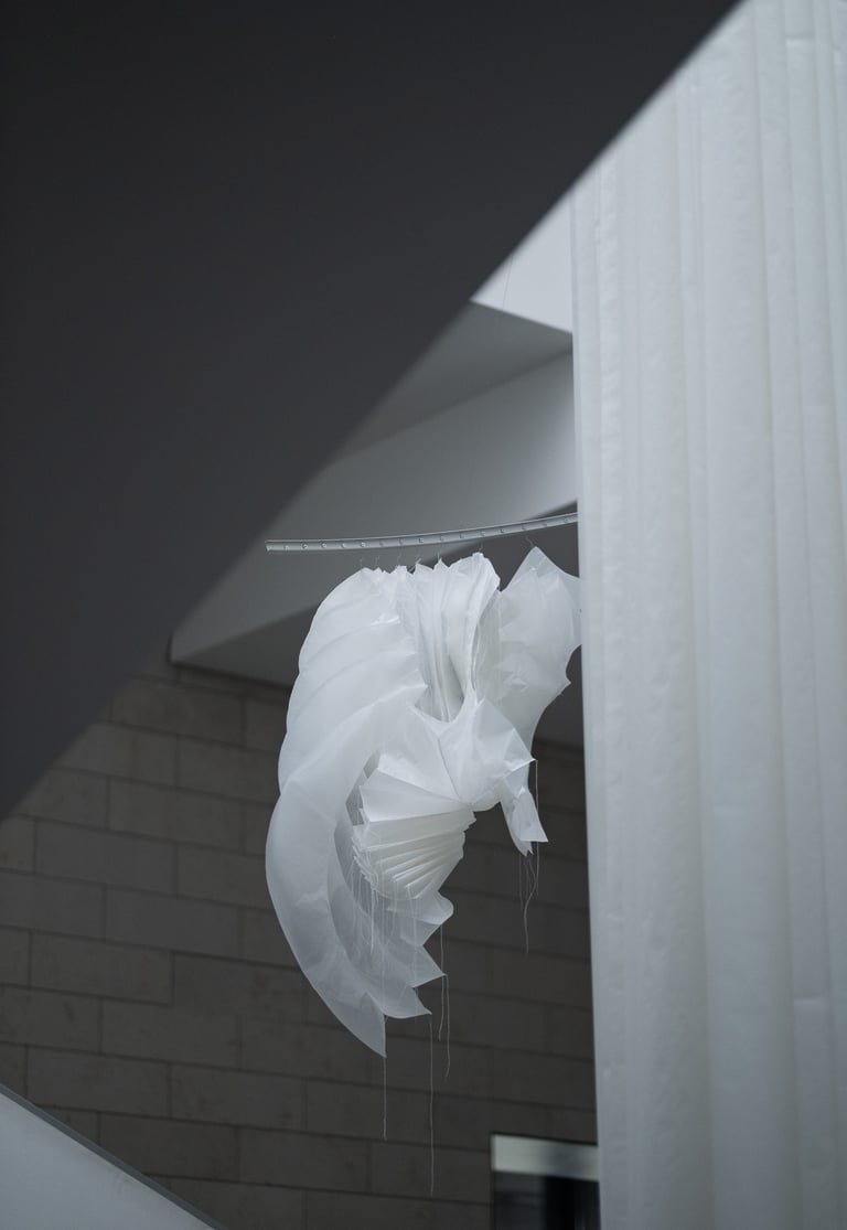 explores the transformation of paper into sculptural form. Composed of translucent layers, the work challenges traditional perceptions of materiality, shifting paper from surface to space, from a functional material to a fragile structure.