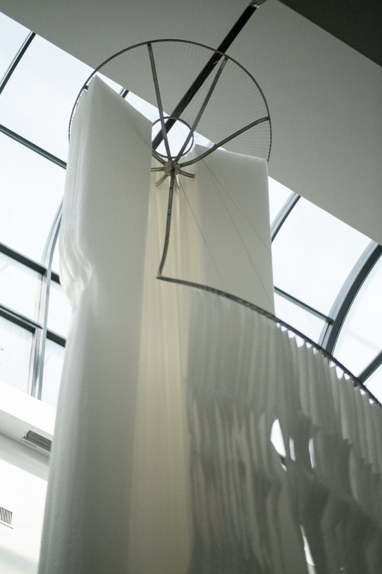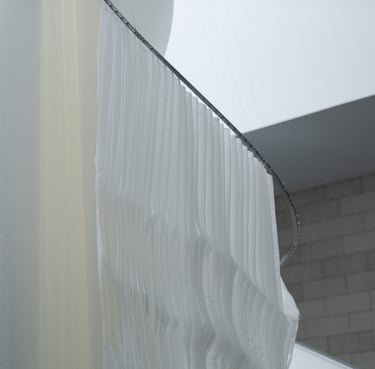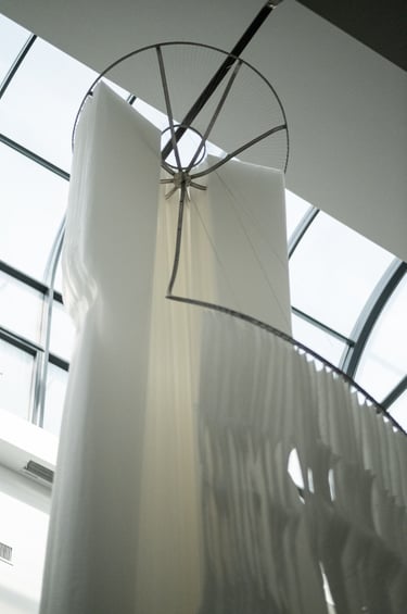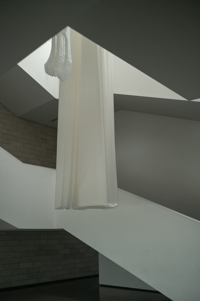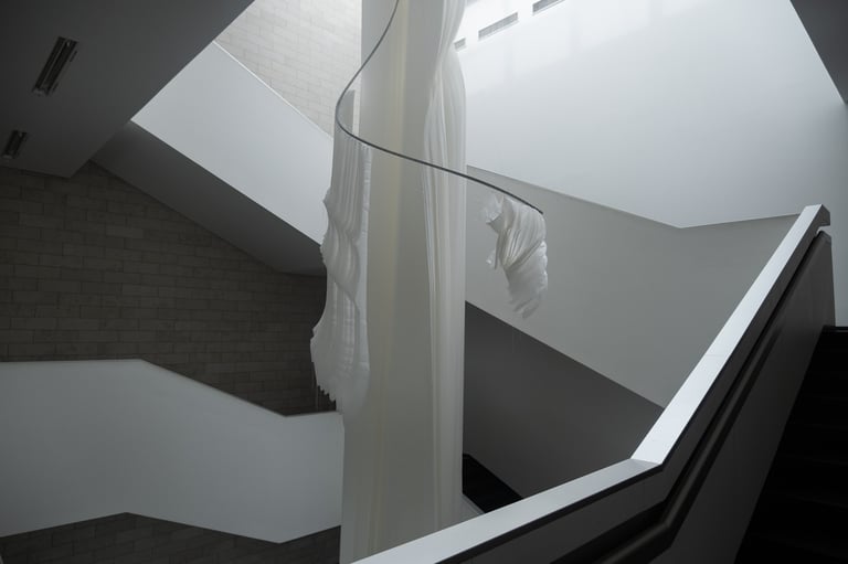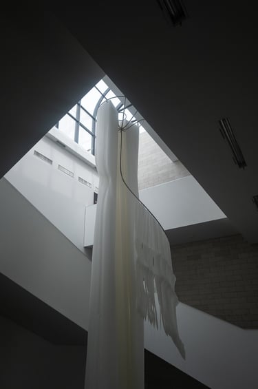 Suspended in the modernist stairwell of the Lithuanian National Gallery of Art in Vilnius, this 9-meter-high structure interrupts the logic of architecture with softness and a sense of physical presence. Its spiraling line evokes the layered history of the space, subtly disrupting the ideology of the white wall and revealing vulnerability, impermanence, and memory